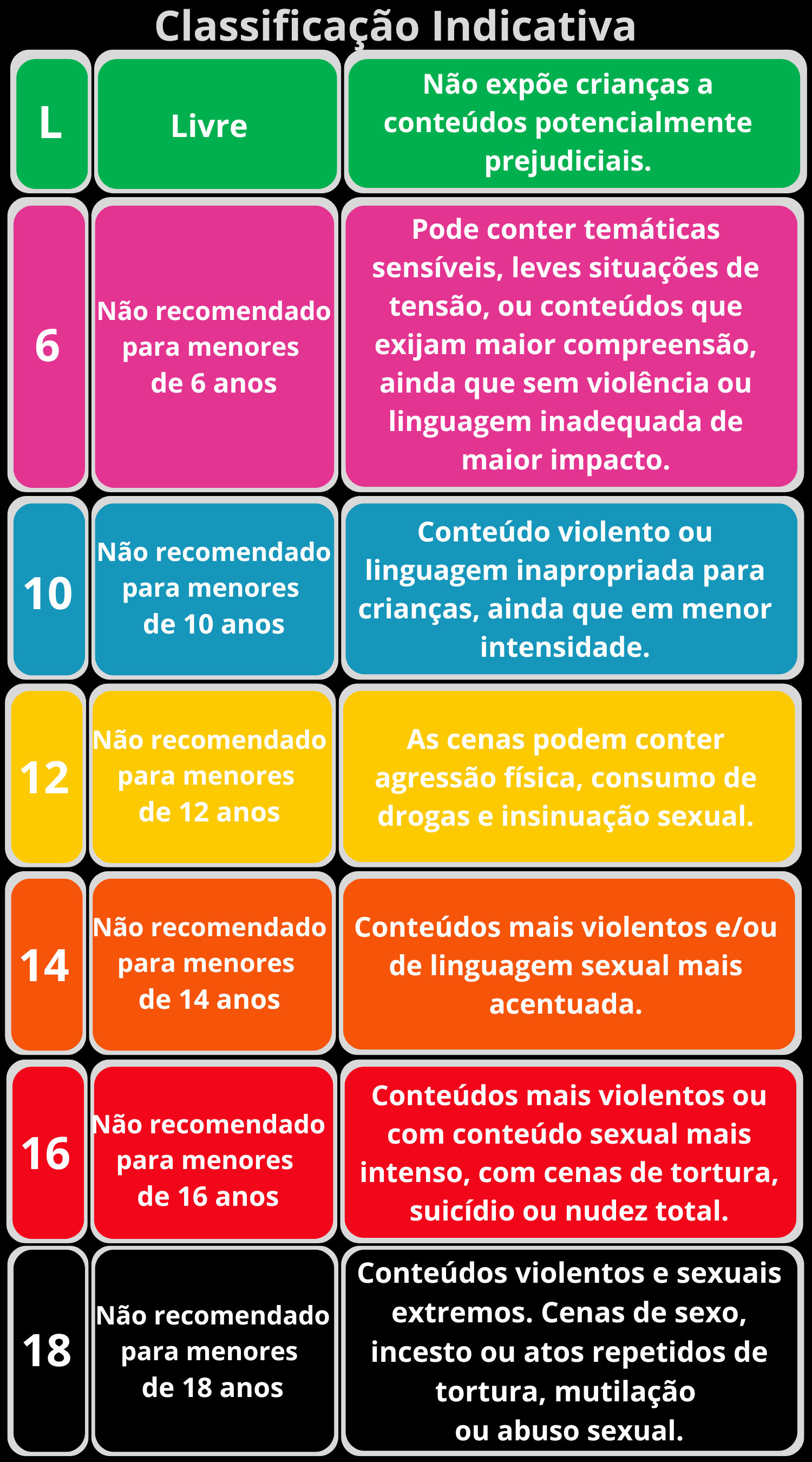 A classificação indicativa dos filmes é realizada de acordo com as disposições da Constituição Federal, do Estatuto da Criança e do Adolescente, da Portaria Nº 502, de 23/11/2021 do Ministério Justiça.